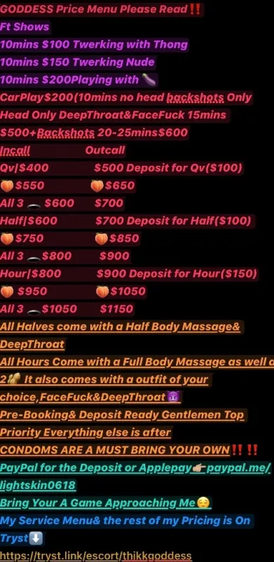 Hey Babes My Name is Goddess I'm Available for OutCalls to🏨&Cardates Only All 3 🕳 Available Cumm Slut Me Tf Out😈 I Squirt& Cream😌Can you make me🤔 ʙɪɢ ᴅɪᴄᴋ ɢᴇɴᴛʟᴇᴍᴇɴ ɪ ᴘʀᴇғᴇʀ🍆I'm very picky&selective So don’t waste my time😉 ⚠VERIFY ME FIRST I MAY NOT BE FOR YOU⬇🗣RESPECT&MANNERS REQUIRED 😉 🛑https://tryst.link/escort/thikkgoddess🪬 🛑Ig👉🏼Goddess_Meddusa🪬 $200+🗣PLEASE READ BOOKING INSTRUCTIONS BEFORE CONTACTING ME✋ 🪬DEPOSIT is REQUIRED To SECURE SPOT💸I will treat you with the same Respect you give😁 🪬Seeking Longterm REGULARS,SugarDaddy CompanionShip& a WIFEY🤏 🪬30 to FtVERIFY Face/Whole Body$50 ⬇My Menu⬇😌Content for My Regulars Only A Shower is Mandotory before we link|No Bare No Daty No Games I WILL NOT RESPOND TO ANY 1 Word Text!! * 💸PaymentMethods:Cash,PayPal,&ApplePay ⬇My REQUIREMENTS TO SEE ME⬇ Half& Up TopPriority Introduce Yourself ALONG WITH A PROPER GREETING 4 A SWIFT REPLY: 🪬ɴᴀᴍᴇ/ᴀɢᴇ/ʀᴀᴄᴇ❓ 💡What Day&Time❓ 💡ǫᴠ/ʜᴀʟғ/ʜᴏᴜʀ/Multi-Hours/ᴏᴠᴇʀɴɪɢʜᴛ❓ 💡ᴡʜᴇʀᴇ ʏᴏᴜ ғᴏᴜɴᴅ ᴍʏ ᴀᴅ❓ 💡ʀᴇɢᴜʟᴀʀ/ᴀɴᴀʟ/ᴀʟʟ 3 🕳❓ 💡Any Special Request (4 Half&Up Only)❓ 💡Are you Deposit Ready❓(Minimum$100 to Book) 🪬Also need a face&dick pic or you can Ft me& show me what you working with ʟɪɢʜᴛ sᴄʀᴇᴇɴɪɴɢ ɪs ʀᴇǫᴜɪʀᴇᴅ ᴏɴᴄᴇ ʏᴏᴜ sᴇɴᴅ ʏᴏᴜʀ ʙᴏᴏᴋɪɴɢ ɪɴғᴏ(ᶠᵗ&ˢⁿᵃᵖᵒⁿˡʸ) 🪬Same Day AppointMents I need a 2 hour Notice+$100 to book.If you want to meet withthin the hour half of the deposit is needed to SECURE SPOT 🗣ℐ 𝒽𝒶𝓋ℯ 𝓉𝒽ℯ 𝓇𝒾𝑔𝒽𝓉 𝓉ℴ 𝒹ℯ𝒸𝓁𝒾𝓃ℯ , ℐ 𝓌𝒾𝓁𝓁 𝓃ℴ𝓉 𝓉ℴ𝓁ℯ𝓇𝒶𝓉ℯ 𝒶𝓃𝓎 ℴ𝒻 𝓉𝒽ℯ 𝒻ℴ𝓁𝓁ℴ𝓌𝒾𝓃𝑔 𝒶𝒷ℴ𝓋ℯ . ℐ 𝒶𝓂 𝒶 𝑔ℴ𝒹𝒹ℯ𝓈𝓈 ℐ 𝓌𝒾𝓁𝓁 𝒷ℯ 𝑔𝓇ℯℯ𝓉ℯ𝒹 , 𝓉𝓇ℯ𝒶𝓉ℯ𝒹 & 𝑔𝒾𝒻𝓉ℯ𝒹 𝓁𝒾𝓀ℯ ℴ𝓃ℯ .