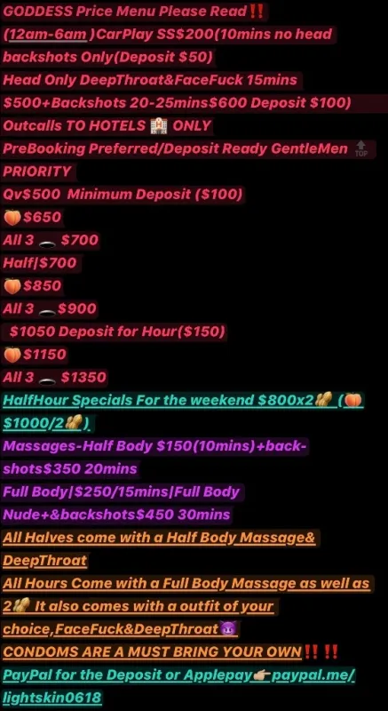 🗣Hey Babes My Name is GoddessAll 3 🕳 Available Cumm Slut Me Tf Out😈 I Squirt& Cream😌Can you make me🤔 RESPECT&DECORUM REQUIRED 😉🍆ʙɪɢ ᴅɪᴄᴋ ɢᴇɴᴛʟᴇᴍᴇɴ ɪ ᴘʀᴇғᴇʀ🍆PRICES ARE FIRM⚠💸$100 DEPOSIT is REQUIRED To SECURE SPOT💸 $200+🗣PLEASE READ BOOKING INSTRUCTIONS BEFORE CONTACTING ME🪬I WILL NOT SEEANYONE WHO DOES NOT READ Or RESPECT MY BOOKING INSTRUCTIONS Introduce Yourself ALONG WITH A PROPER GREETING ⬇My Requirements to Book Wimme⬇$30to Ft VERIFY Face/Whole Body$50 🪬ɴᴀᴍᴇ/ᴀɢᴇ/ʀᴀᴄᴇ❓ 💡What Day&Time❓💡ǫᴠ/ʜᴀʟғ/ʜᴏᴜʀ/Multi-Hour/ᴏᴠᴇʀɴɪɢʜᴛ❓ 💡ʀᴇɢᴜʟᴀʀ/ᴀɴᴀʟ/ᴀʟʟ 3 🕳❓ 💡ᴡʜᴇʀᴇ ʏᴏᴜ ғᴏᴜɴᴅ ᴍʏ ᴀᴅ❓ 💡Are you Deposit Ready❓(Minimum$100 Deposit) 🪬Also need a face&dick pic or you can Ft me& show me what you working with ʟɪɢʜᴛ sᴄʀᴇᴇɴɪɴɢ ɪs ʀᴇǫᴜɪʀᴇᴅ ᴏɴᴄᴇ ʏᴏᴜ sᴇɴᴅ ʏᴏᴜʀ ʙᴏᴏᴋɪɴɢ ɪɴғᴏ(ᶠᵗ&ˢⁿᵃᵖᵒⁿˡʸ) 🪬No Bare No Daty No Games🪬BeWare I am Hairy🤭🫢 Same Day Appts 2 hour Notice+$100& if you want to meet ASAP half is needed To SECURE SPOT ⚠VERIFY ME FIRST I MAY NOT BE FOR YOU🛑 ➡https://tryst.link/escort/thikkgoddess ➡Ig👉🏼Goddess_Meddusa 🪬Seeking Longterm REGULARS,SugarDaddy CompanionShip& a WIFEY🤏 I will treat you with the same Respect you give😁A Shower is Mandotory before we link 💸PaymentMethods:Cash&PayPal&Chime ℐ 𝒽𝒶𝓋ℯ 𝓉𝒽ℯ 𝓇𝒾𝑔𝒽𝓉 𝓉ℴ 𝒹ℯ𝒸𝓁𝒾𝓃ℯ , ℐ 𝓌𝒾𝓁𝓁 𝓃ℴ𝓉 𝓉ℴ𝓁ℯ𝓇𝒶𝓉ℯ 𝒶𝓃𝓎 ℴ𝒻 𝓉𝒽ℯ 𝒻ℴ𝓁𝓁ℴ𝓌𝒾𝓃𝑔 𝒶𝒷ℴ𝓋ℯ, ℐ 𝒶𝓂 𝒶 𝑔ℴ𝒹𝒹ℯ𝓈𝓈 ℐ 𝓌𝒾𝓁𝓁 𝒷ℯ 𝑔𝓇ℯℯ𝓉ℯ𝒹 , 𝓉𝓇ℯ𝒶𝓉ℯ𝒹 & 𝑔𝒾𝒻𝓉ℯ𝒹 𝓁𝒾𝓀ℯ ℴ𝓃ℯ .