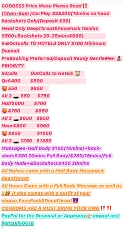 Incalls Specials Until Friday👉🏼If you can PreBook NO HASSLE next visit$100-$200 off(You would have to Prebook Your next appt. withthin the next 2weeks)PreBooking /Deposit Ready GentleMen 🔝 PRIORITY🤏 ⚠VERIFY ME FIRST I MAY NOT BE FOR YOU⬇ 🛑https://tryst.link/escort/thikkgoddess🪬🛑Ig👉🏼Goddess_Meddusa🪬 $200+🗣PLEASE READ BOOKING INSTRUCTIONS BEFORE CONTACTING ME✋ ⬇My REQUIREMENTS TO SEE ME⬇ Half& Up TopPriority Format Example: Hey Goddess I'm trying to book for_____🪬ɴᴀᴍᴇ/ᴀɢᴇ/ʀᴀᴄᴇ❓ 💡What Day&Time❓ 💡ǫᴠ/ʜᴀʟғ/ʜᴏᴜʀ/Multi-Hours/ᴏᴠᴇʀɴɪɢʜᴛ❓ 💡ᴡʜᴇʀᴇ ʏᴏᴜ ғᴏᴜɴᴅ ᴍʏ ᴀᴅ❓ 💡ʀᴇɢᴜʟᴀʀ/ᴀɴᴀʟ/ᴀʟʟ 3 🕳❓ 💡Any Special Request (4 Half&Up Only)❓ 💡Are you Deposit Ready❓(Minimum$100 to Book) 🪬Also need a face&dick pic or you can Ft me& show me what you working with 🛑ʟɪɢʜᴛ sᴄʀᴇᴇɴɪɴɢ ɪs ʀᴇǫᴜɪʀᴇᴅ ᴏɴᴄᴇ ʏᴏᴜ sᴇɴᴅ ʏᴏᴜʀ ʙᴏᴏᴋɪɴɢ ɪɴғᴏ(ᶠᵗ&Ig Only) Not here for drama or games.Seeking GentleMen Who are respectful,mature, and know how to communicate,GentleMen who (𝗕𝗿𝗶𝗻𝗴 𝗬𝗼𝘂𝗿 𝗔 𝗚𝗮𝗺𝗲)If that sounds like you, I’d love to hear from you. Respecful ʙɪɢ ᴅɪᴄᴋ ɢᴇɴᴛʟᴇᴍᴇɴ ɪ ᴘʀᴇғᴇʀ🍆I'm very picky&selective So don’t waste my time😉🪬 🪬Seeking Longterm REGULARS,SugarDaddy CompanionShip& a WIFEY🤏 🪬30 to FtVERIFY Face/Whole Body$50 ⬇My Menu⬇😌Content for My Regulars Only|A Shower is Mandotory before we link|No Bare No Daty No Games I WILL NOT RESPOND TO ANY 1 Word Text!! *💸PaymentMethods:Cash,PayPal,&ApplePay 🪬Same Day AppointMents I need a 2 hour Notice.If you want to meet ASAP half of the deposit is needed to SECURE SPOT 🗣ℐ 𝒽𝒶𝓋ℯ 𝓉𝒽ℯ 𝓇𝒾𝑔𝒽𝓉 𝓉ℴ 𝒹ℯ𝒸𝓁𝒾𝓃ℯ , ℐ 𝓌𝒾𝓁𝓁 𝓃ℴ𝓉 𝓉ℴ𝓁ℯ𝓇𝒶𝓉ℯ 𝒶𝓃𝓎 ℴ𝒻 𝓉𝒽ℯ 𝒻ℴ𝓁𝓁ℴ𝓌𝒾𝓃𝑔 𝒶𝒷ℴ𝓋ℯ . ℐ 𝒶𝓂 𝒶 𝑔ℴ𝒹𝒹ℯ𝓈𝓈 ℐ 𝓌𝒾𝓁𝓁 𝒷ℯ 𝑔𝓇ℯℯ𝓉ℯ𝒹 , 𝓉𝓇ℯ𝒶𝓉ℯ𝒹 & 𝑔𝒾𝒻𝓉ℯ𝒹 𝓁𝒾𝓀ℯ ℴ𝓃ℯ .